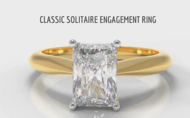 This classic solitaire engagement ring features a delicate yellow gold band, which tapers towards the radiant cut center diamond of your choice, accentuating its beauty.