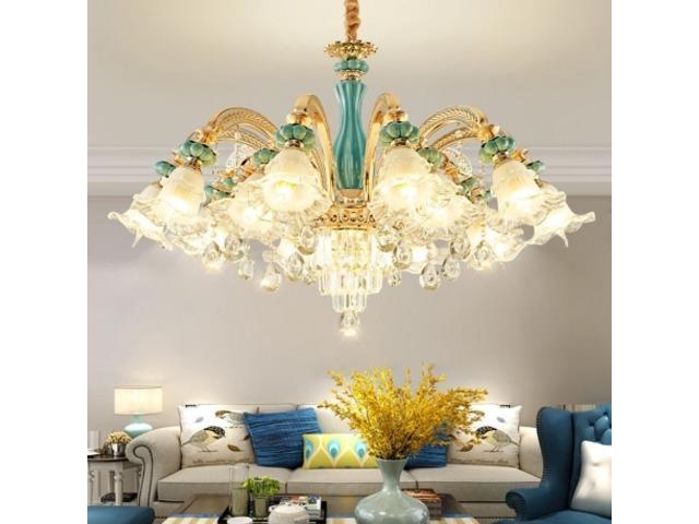 Chandelier Geniune K9 Crystal Blue Ceramic Gold Metal Arms Pendant Ceiling Lamp