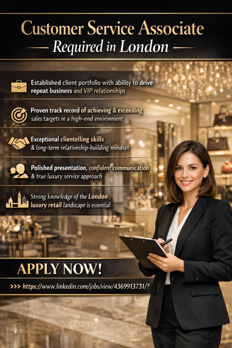 A prestigious luxury fashion house is seeking an experienced and highly client-focused Senior Client Advisor to join its flagship London boutique. This is an exceptional opportunity for a strong seller with an established client book and a proven background in luxury Ladies’ Ready-to-Wear.