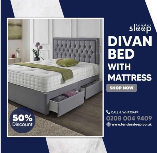 A divan bed with a mattress combines comfort and practicality, offering a seamless sleep solution. These beds often feature built-in storage drawers, optimizing space in the bedroom. The mattress complements the divan base, providing support and ensuring a restful night's sleep, making it a convenient and cozy choice for any bedroom.