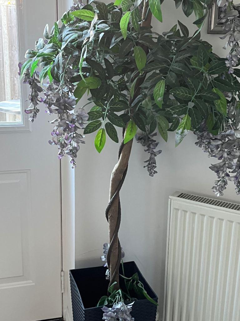 Faux wisteria tree , petals mauve but mostly silver in black pot as shown