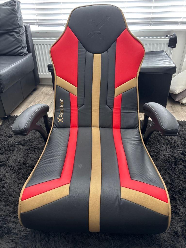 X rocking gaming chair only used a few times has built in speakers comes with instructions and wires has slight damage as seen in photo
