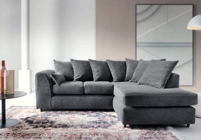 A grey jumbo cord corner sofa? Perhaps in brown? We have it both! Enjoy a lavish chaise corner sofa upholstered in the most pristine soft structured cord chenille fabric there is. Soft to the touch. Opulent and inviting in its visual appeal. Angular arms, a pared back and generously filled scatter cushions provide a very contemporary style statement. A sofa destined to become your old faithful. Choose from an earthy black and grey colour pairing or a warmer brown and beige pairing.