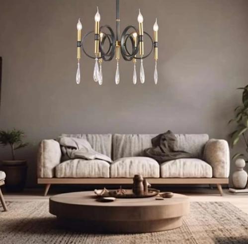This circle arm chandelier lighting fixture with classical black paint and Hanging crystal creates a relaxing and comfortable atmosphere, a good choice for your kitchen, living room and entryway.