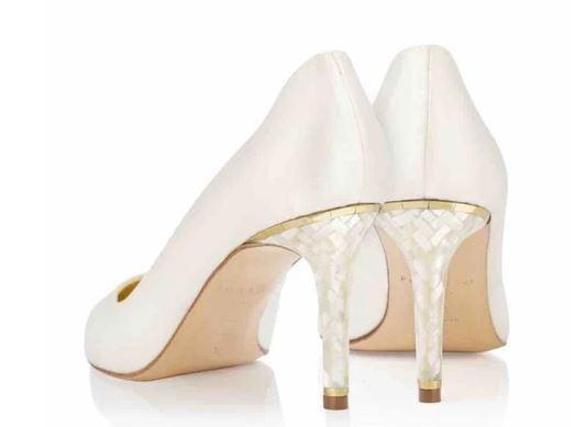 Buy Ivory block heels from our Bridal collection of elegant designer wedding shoes at Freya rose. This is a timeless and luxurious ivory satin, high heel court shoe with an intricate Swarovski crystal heel embellishment.