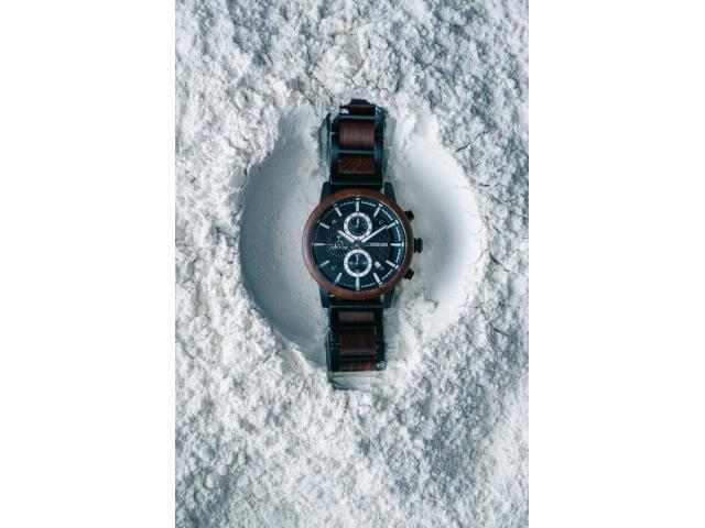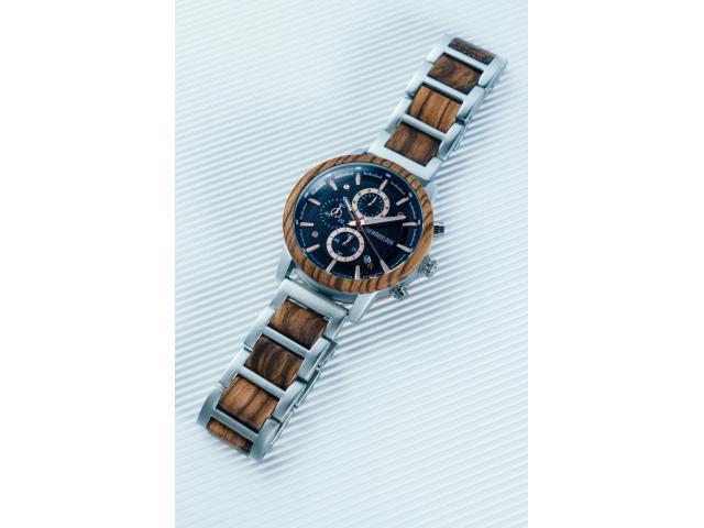 This watch features multi-functional chronograph dials within a perfectly hand-cut wood frame and bracelet.