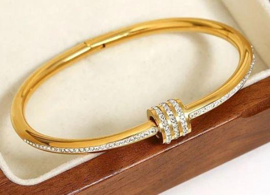 Meet Glamourize Luxury & Glamour's Luxury Gold Triple Row Detail Bracelet. It's simple yet elegant, with three rows of shiny cubic zirconia. You can easily open and close it with a screw closure. It's perfect for everyday wear, adding a touch of sparkle to your outfit effortlessly.