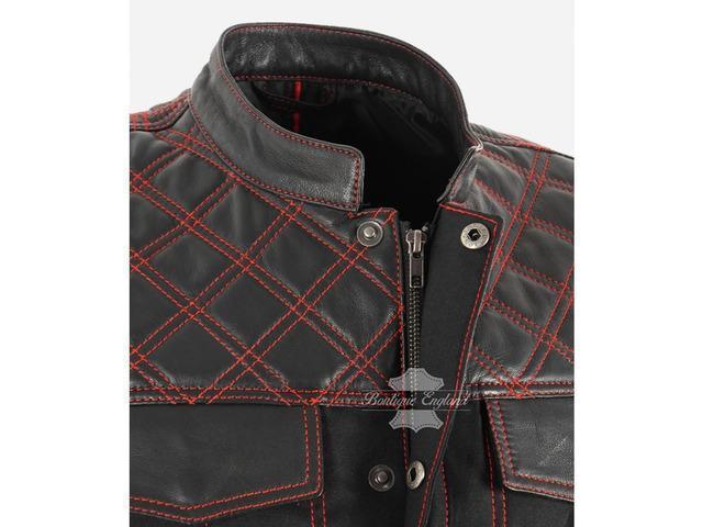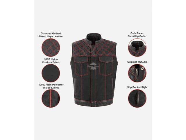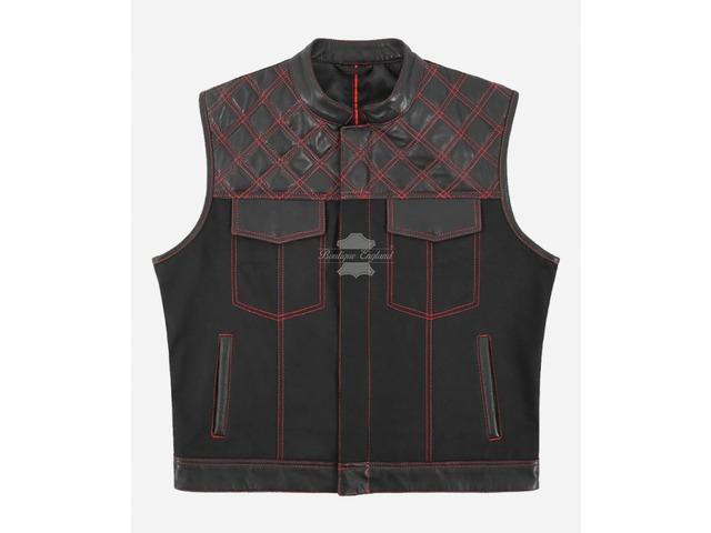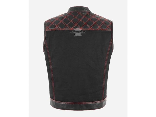 Men's Leather Biker Waistcoat Cordura Black Red Stitching Quilted SOA Vest - London