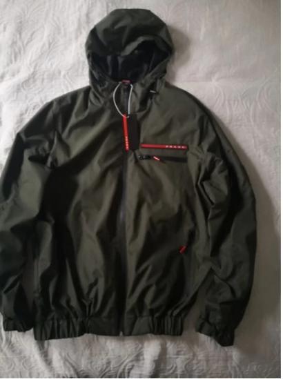 Prada Hooded Bomber Style Outdoor Rain Jacket. Brand new with tag. Size XXL, but fits more like XL. 2 Zipped side pockets, 1 zipped breast pocket, 1 zipped arm pocket and pouch. Lightweight, not padded or quilted. Selling due to car purchase, cash needed! Excellent quality and value compared to original price! Can't post due to high value. Buyer must try on for size and be satisfied with purchase.