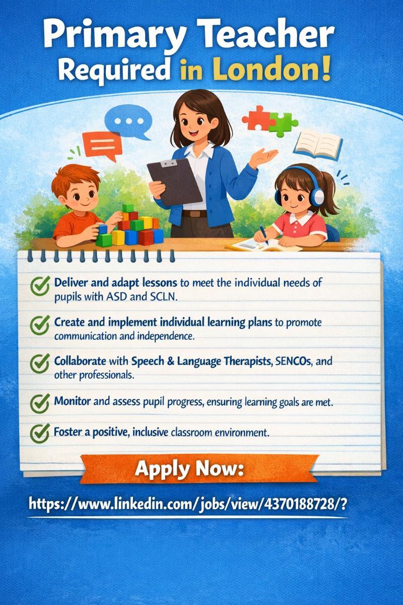 A supportive and community:focused SEN school in Lambeth is seeking a dedicated and experienced Primary Teacher to join their team. This full:time position is ideal for a compassionate educator looking to make a lasting difference in the lives of KS1 pupils with Autism (ASD) and Speech, Communication and Language Needs (SCLN).
