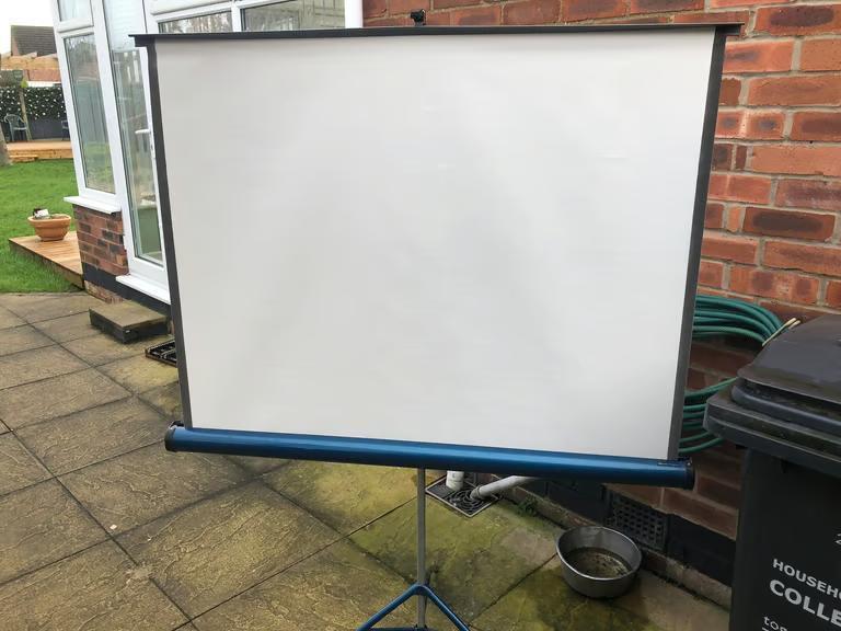 Giant projector screen, opens up to 120cm, comes with stand and with its box. Easy to assemble and can be put anywhere. Carry handle for easy lift. 120cm wide . Good condition