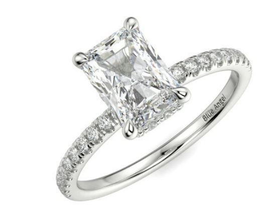 The Radiant Hidden Halo Engagement Ring boasts timeless elegance with a modern touch. Featuring a radiant-cut center diamond embraced by a delicate hidden halo, it blends classic sophistication with contemporary style for a captivating symbol of everlasting love.