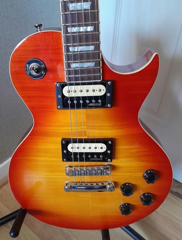 Vintage lp style guitar beautiful cherry sunburst finish pickup surround replaced with black from cream stand included as new condition no scratches or dings collection only. bass trades considered!