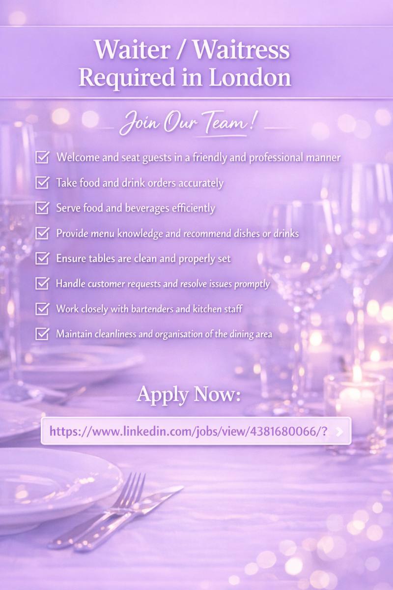 As a Waiter/Waitress, you will be responsible for providing excellent table service, ensuring guests enjoy a great dining and nightlife experience.